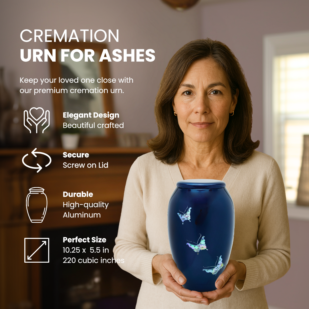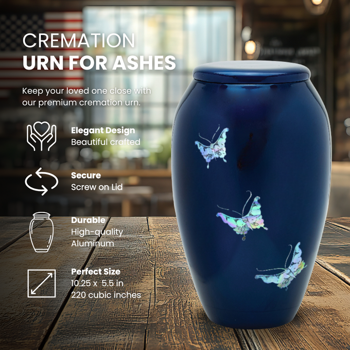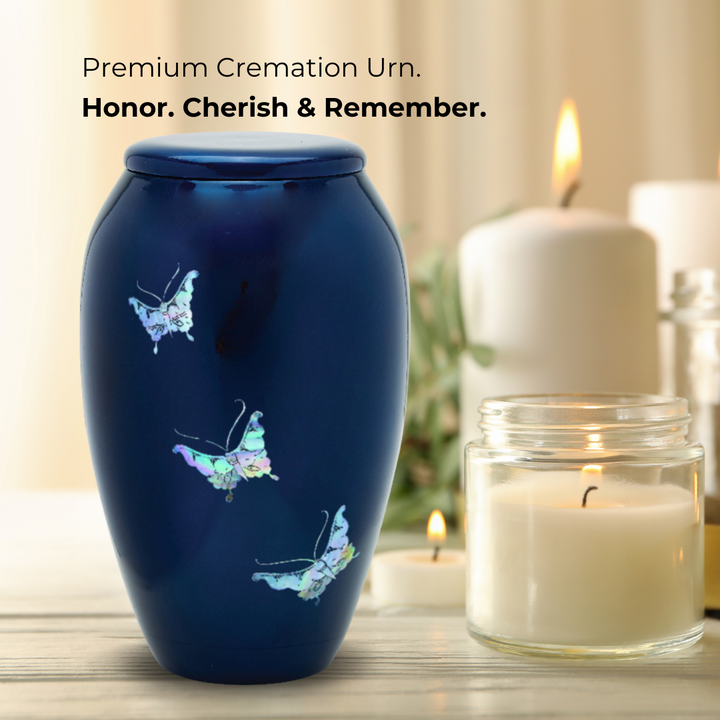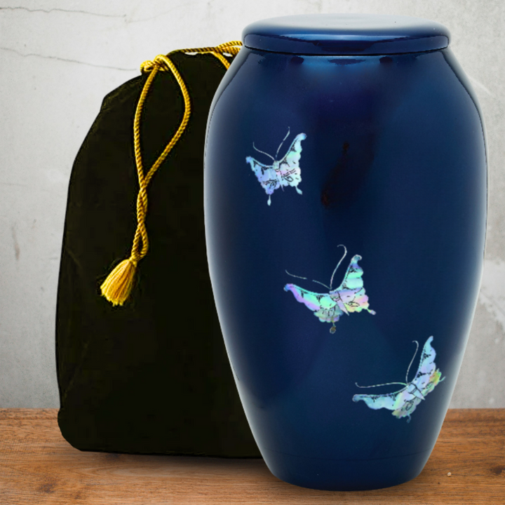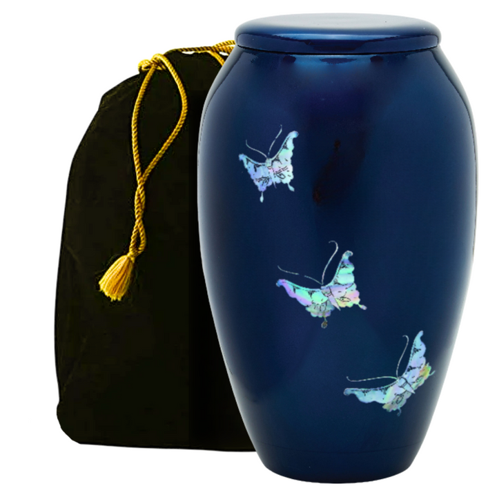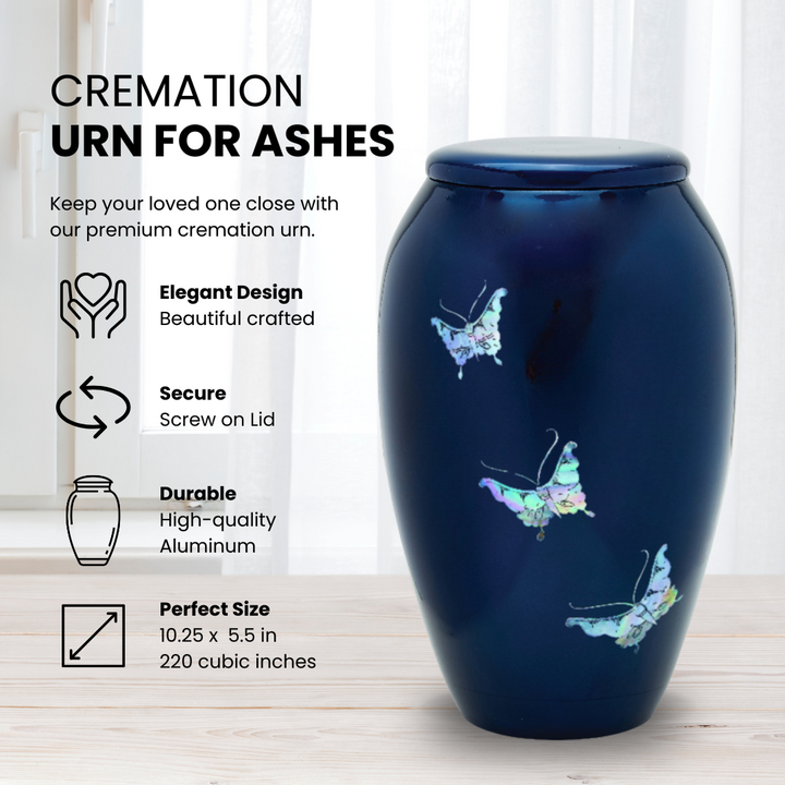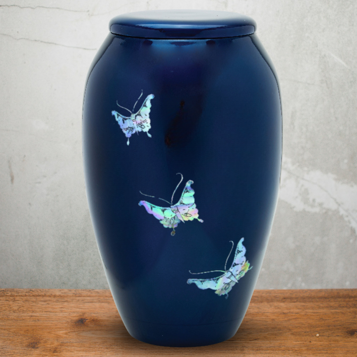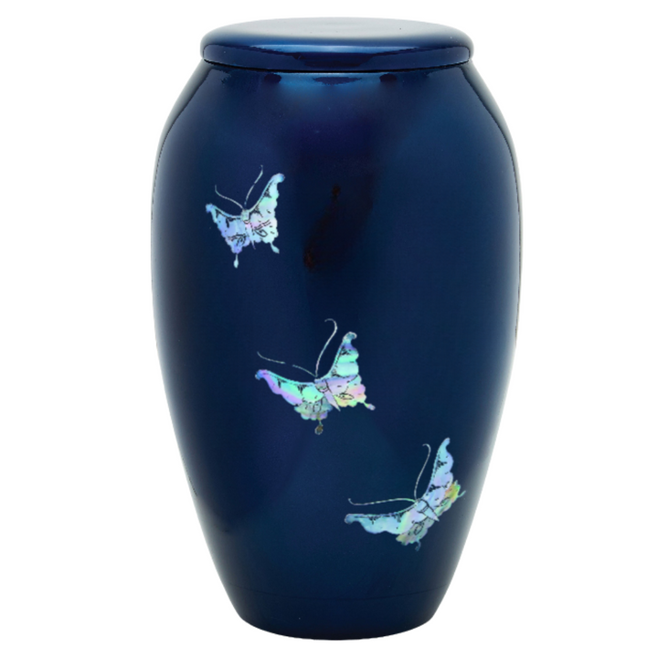 Blue Butterfly Adult Cremation Urn is a vibrant blue colored urn with real mother of pearl used to create ascending butterflies up the face of the urn.