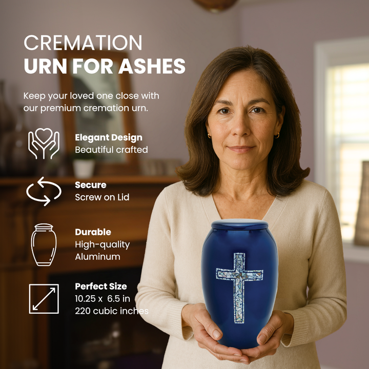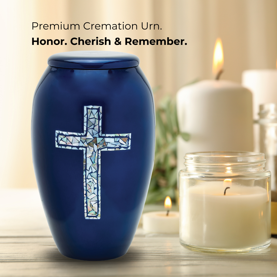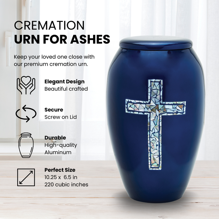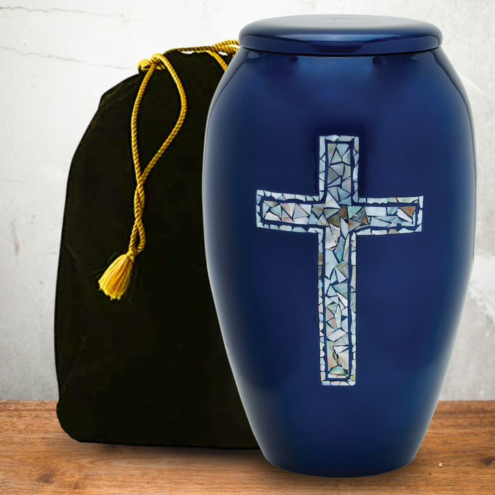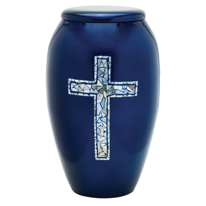 The Blue Cross Adult Cremation Urn offers a graceful symbol of faith and comfort. The radiant cross, made from real mother of pearl and hand-applied by skilled artisans, shimmers against a deep blue background, creating a meaningful memorial that reflects hope, love, and eternal peace.