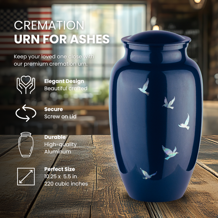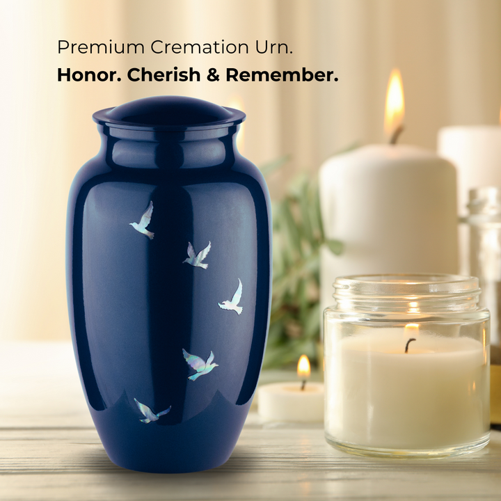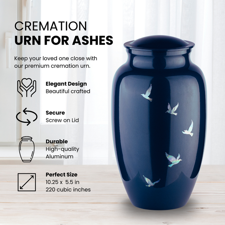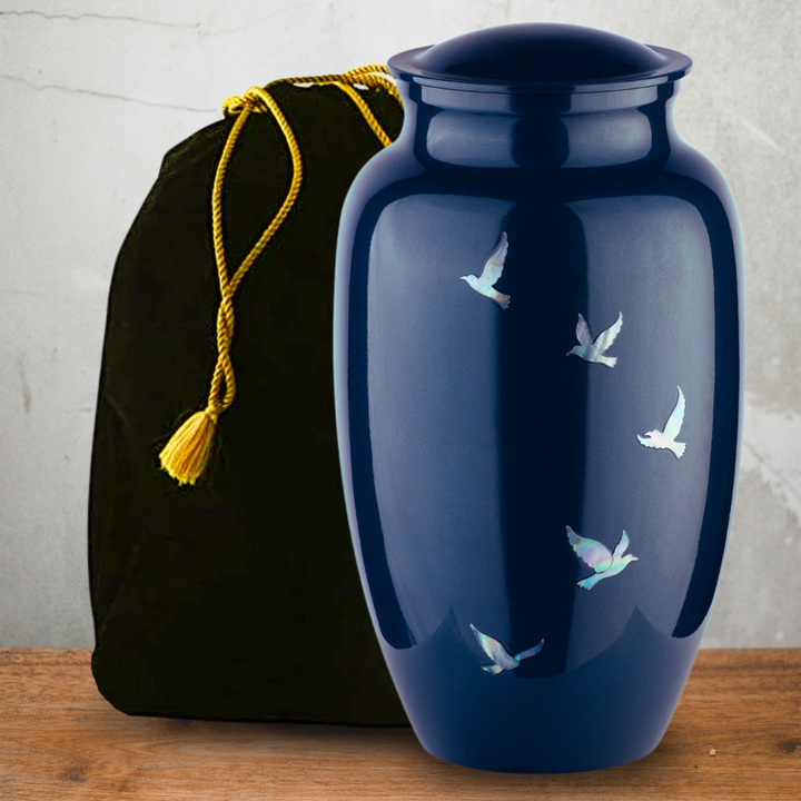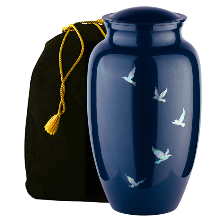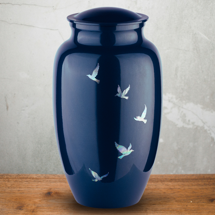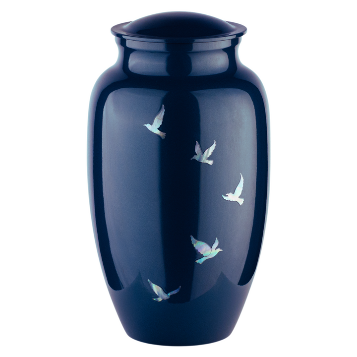 Blue Cycle of Life Adult Urn is a spectacular depiction of a doves flying through the infinity patter on a brilliant blue colored urn. The doves on this urn is made of real mother of pearl and hand applied