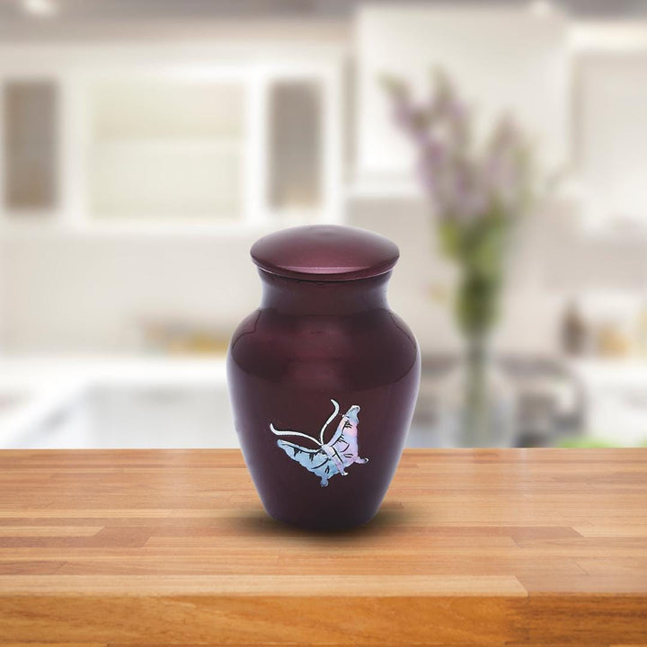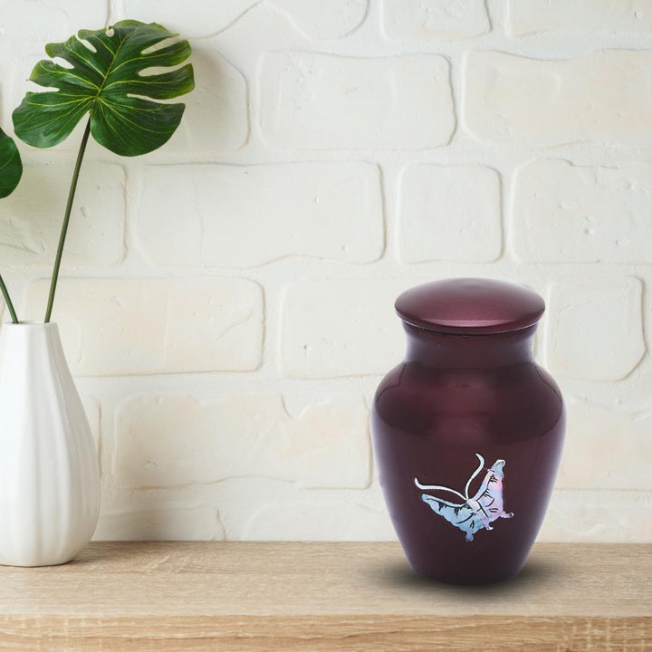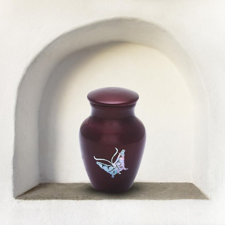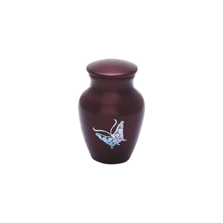 Butterfly Tranquility Token Urn is a token sized cremation urn in burgundy with real mother of pearl used to create the butterflies.