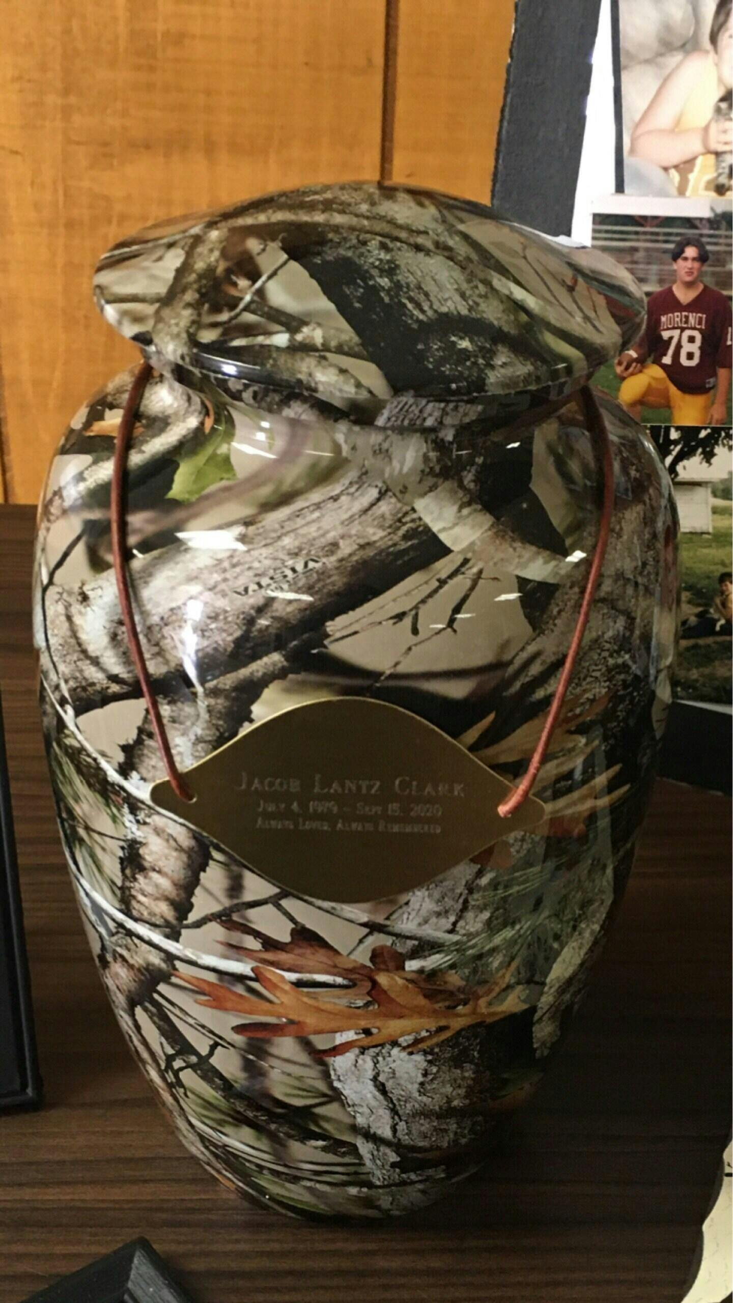 Camo Adult Urn features a hand dipped design depicting the popular camouflage design