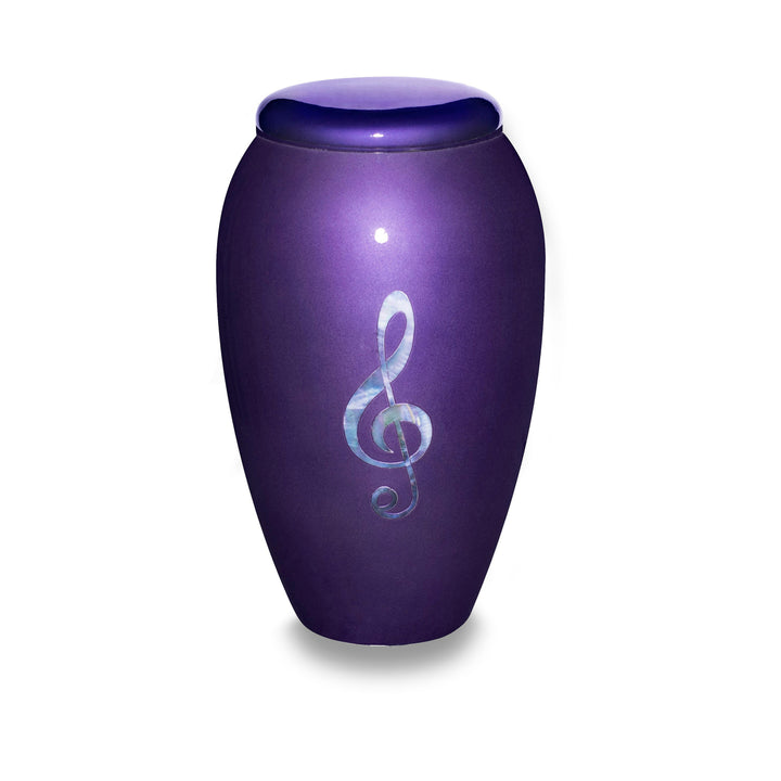 Full size adult cremation urn features real mother of pearl, hand applied in the shape of the iconic music note on a purple colored urn