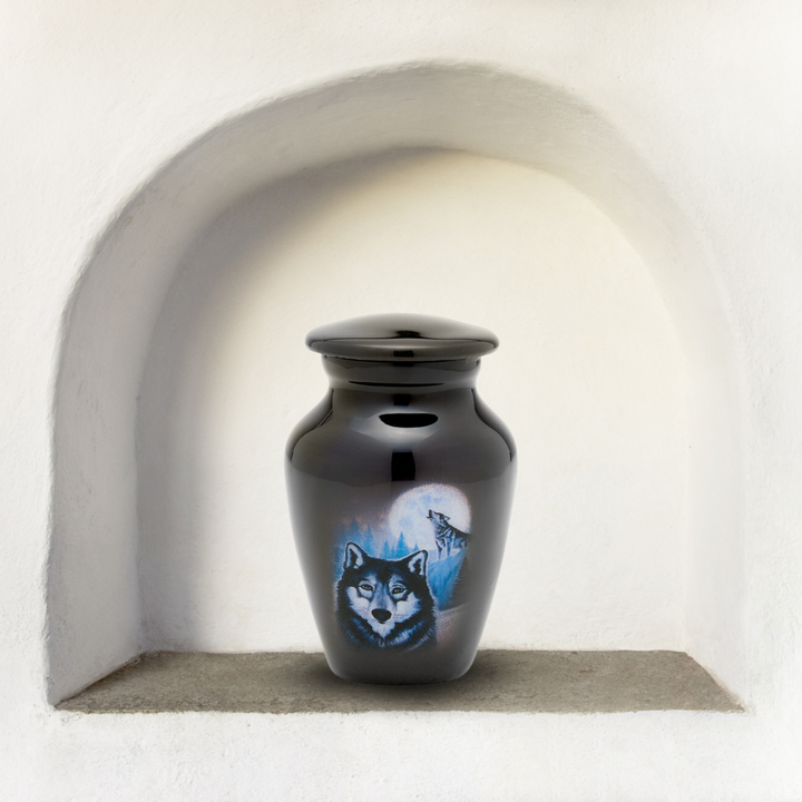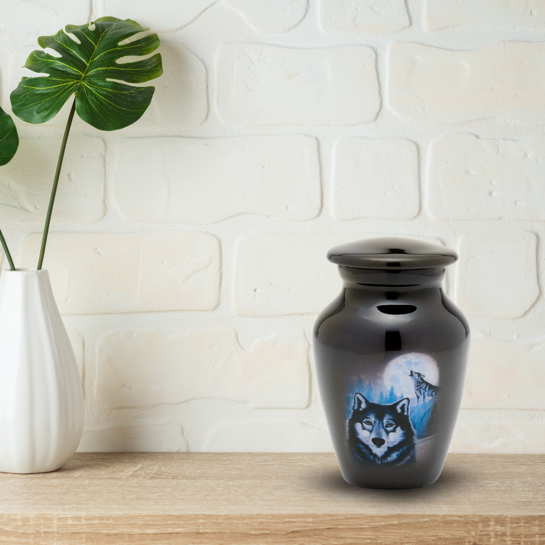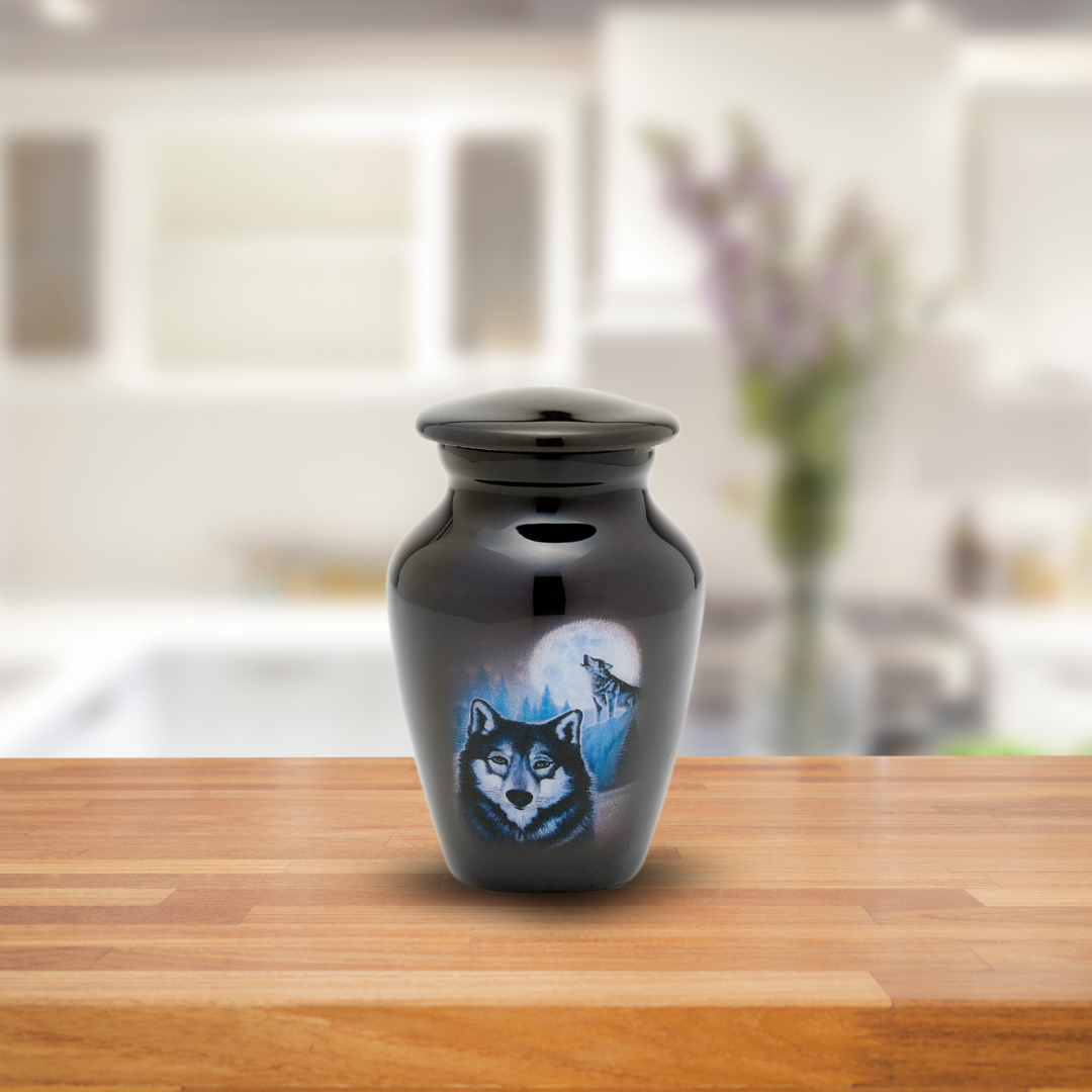 Full Moon Wolf Token Urn depicts a scene as imagined and created, exclusively by a prominent America artist