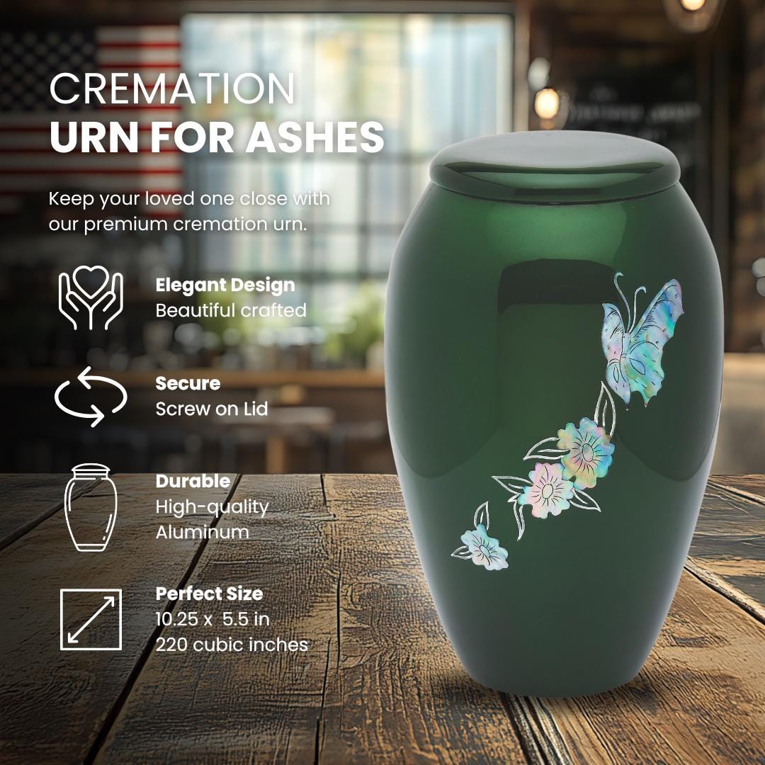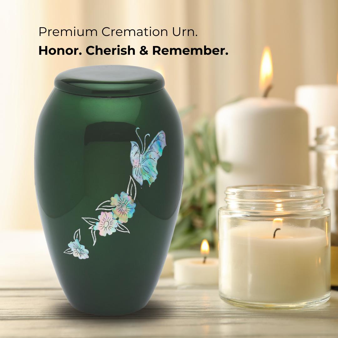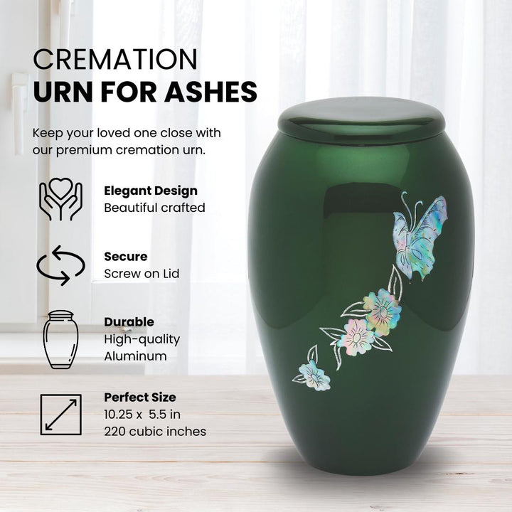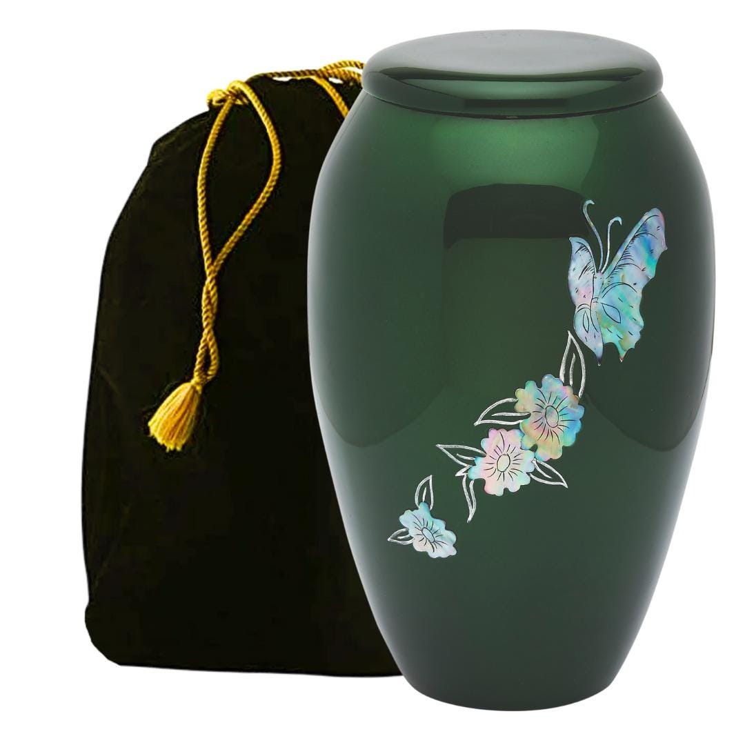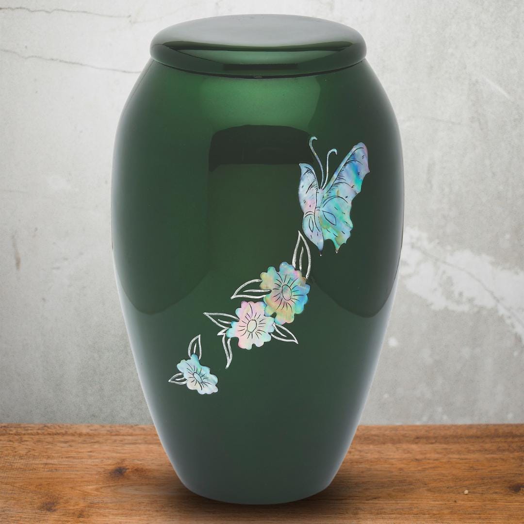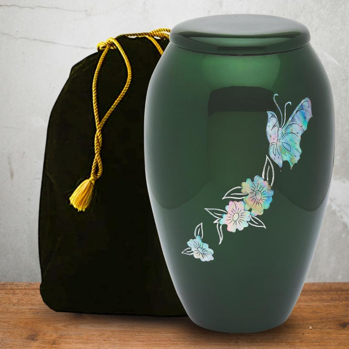 Full size adult urn featuring vivid green coloration and real mother of pearl to create the flitting butterflies