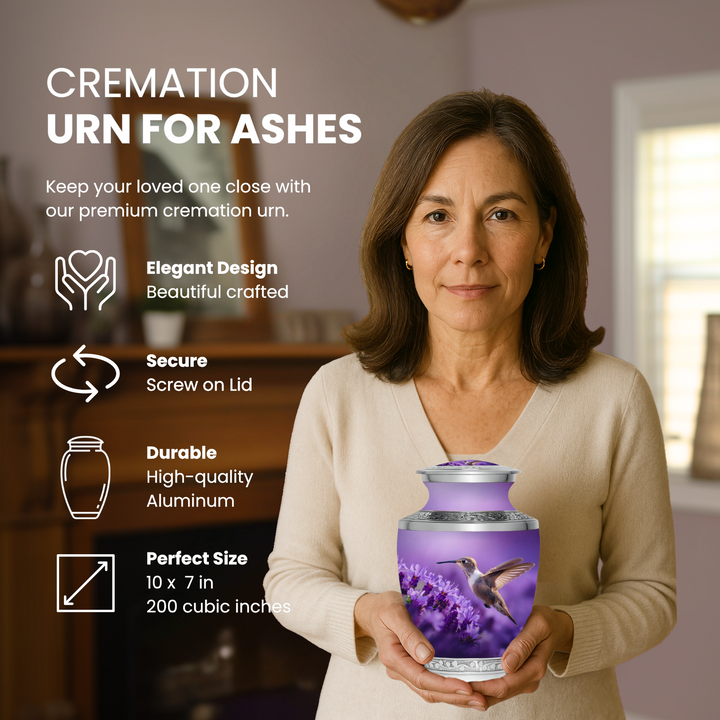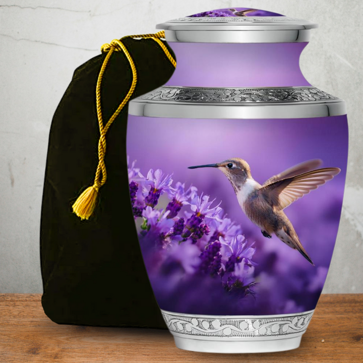 Honor your loved one with this beautiful purple hummingbird urn, symbolizing peace, love, and spiritual freedom. The vibrant purple background with a detailed hummingbird design creates a heartfelt and uplifting tribute.
