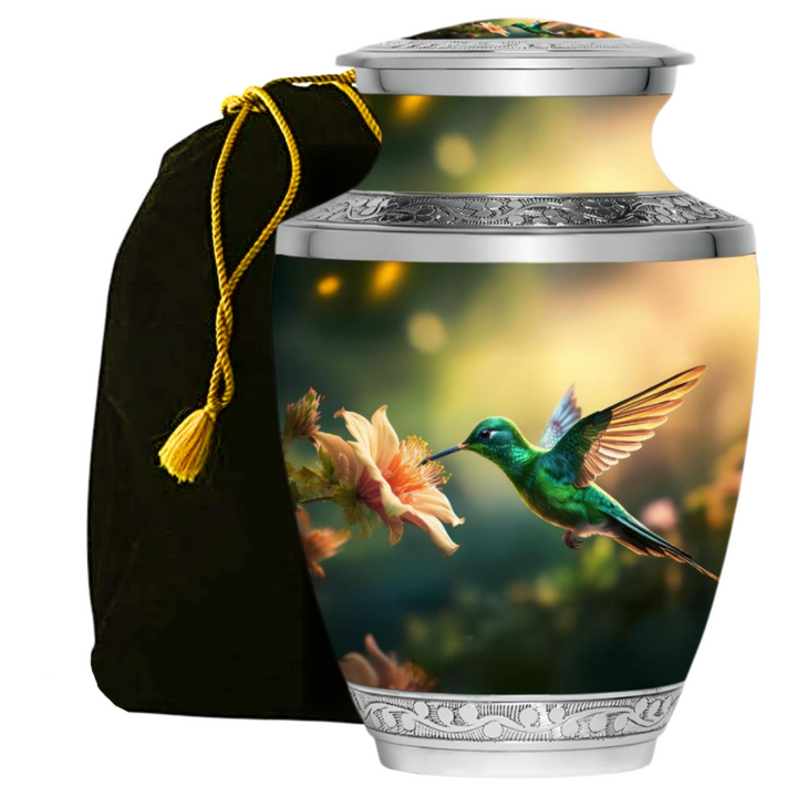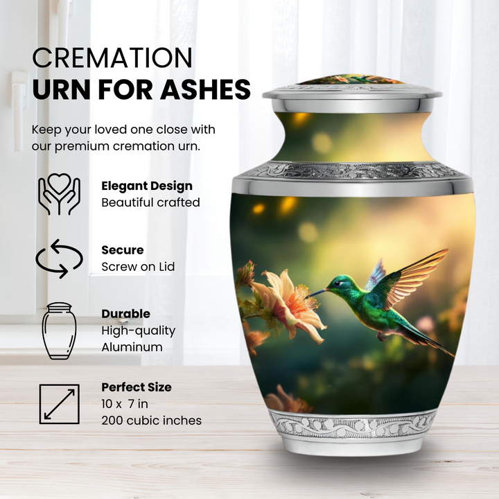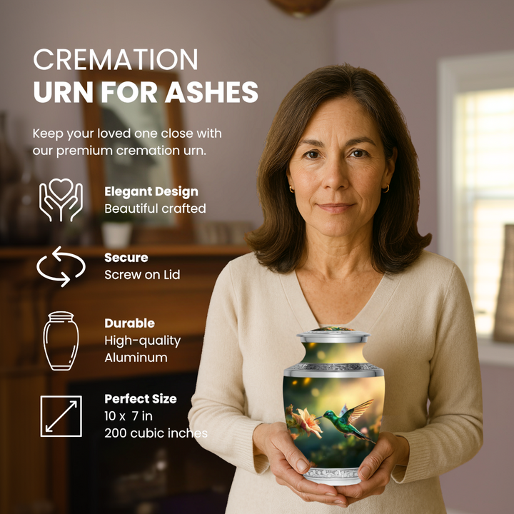 Celebrate the life of someone special with this exquisitely crafted Hummingbird Cremation Urn for Ashes. Featuring a serene and colorful hummingbird in flight among delicate florals, this urn symbolizes joy, healing, and everlasting love. It offers a comforting tribute that brings beauty and meaning to a difficult time.