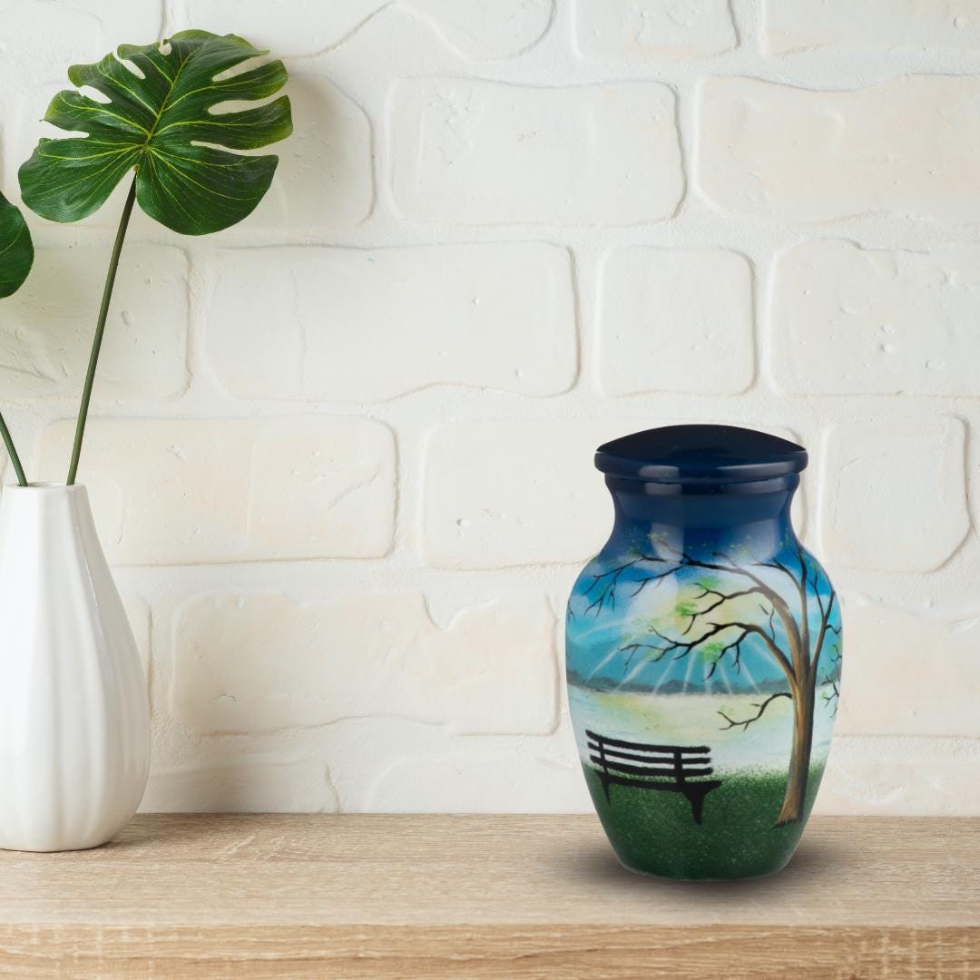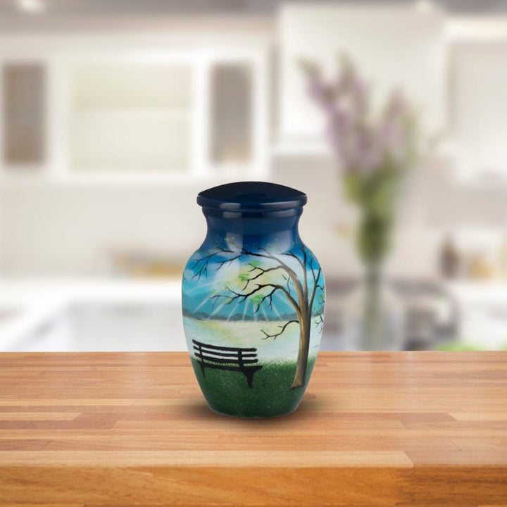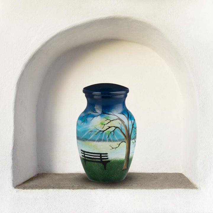 Lakeside View Token Urn is a token sized cremation urn, hand painted with a scene depicting a serene lake view in the park