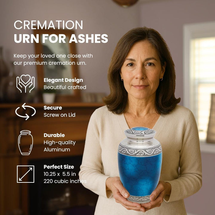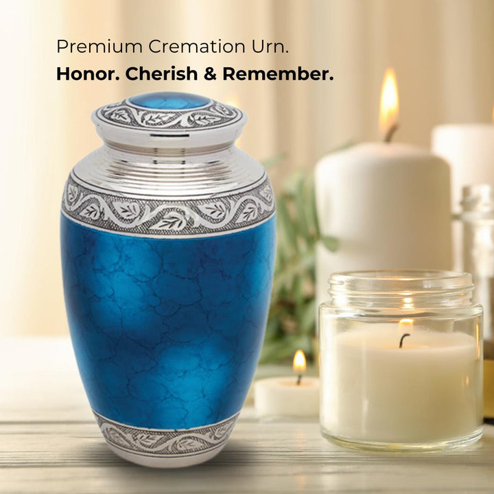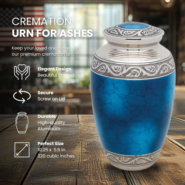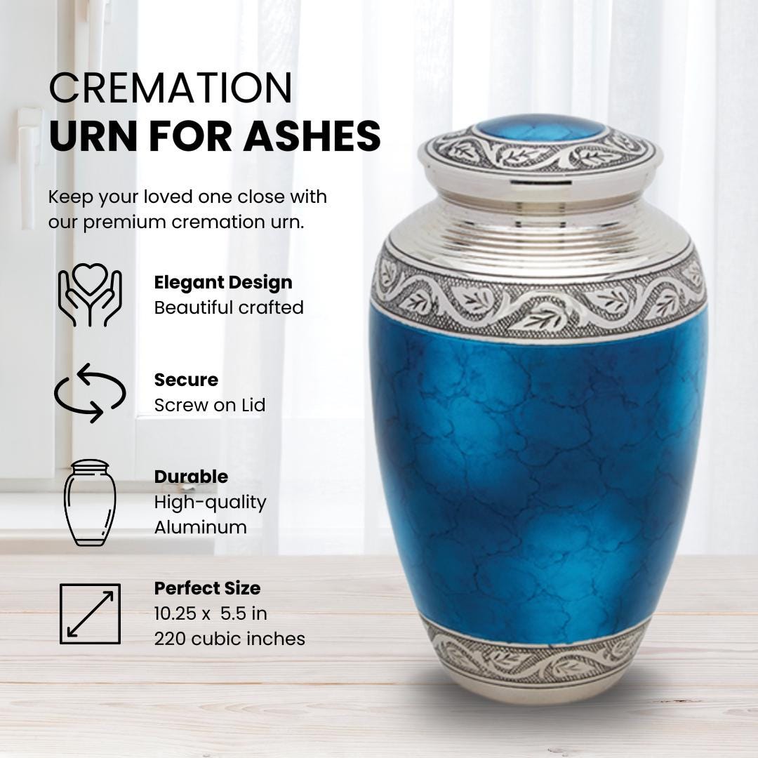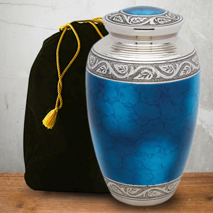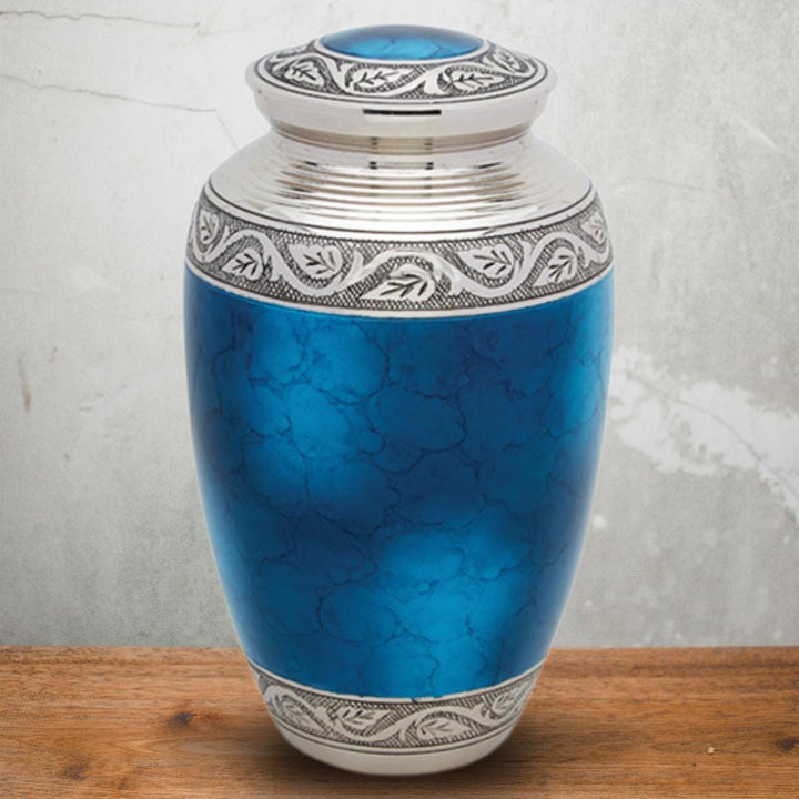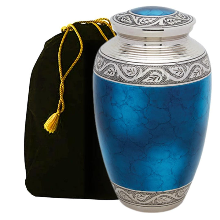 Mediterranean Blue Adult Urn is the popular Grecian blue urn, in aluminum