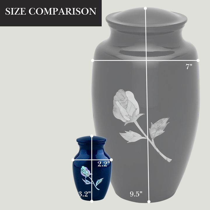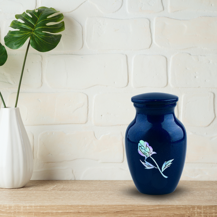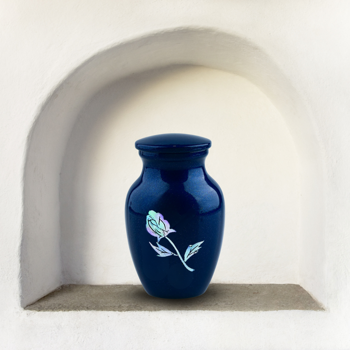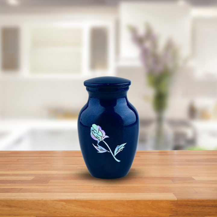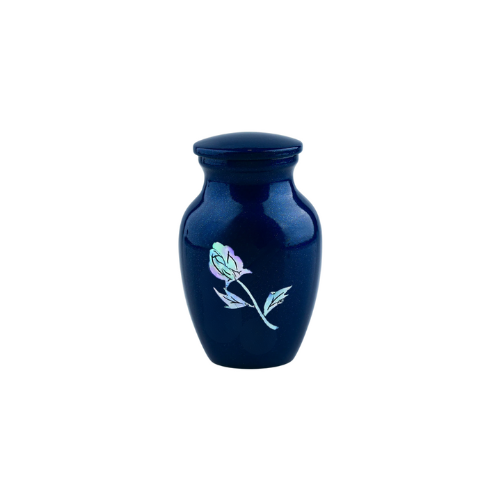 MOP Blue Rose Token Urn is a keepsake sized cremation urn in Blue with real mother of pearl used to create the exquisite rose