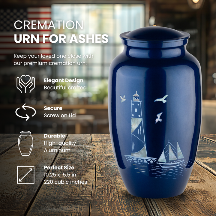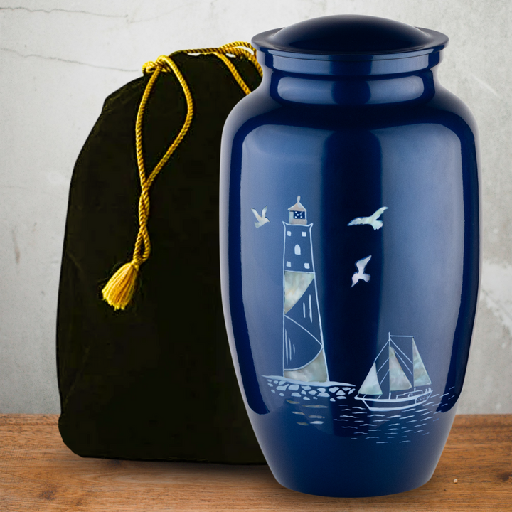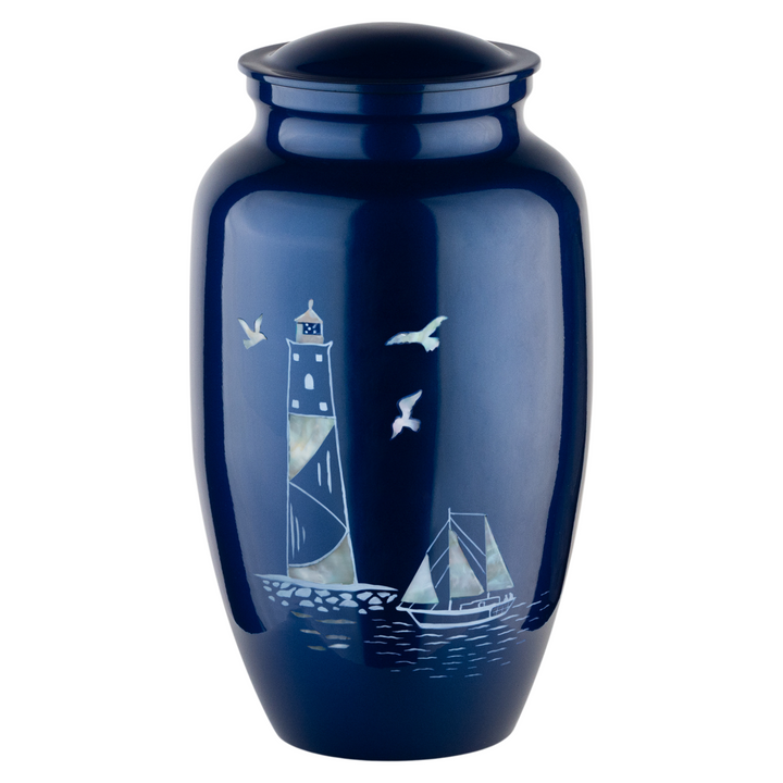MOP Lighthouse Adult Urn is a spectacular depiction of a lighthouse on a brilliant blue colored urn. The lighthouse on this urn is made of real mother of pearl and hand applied.