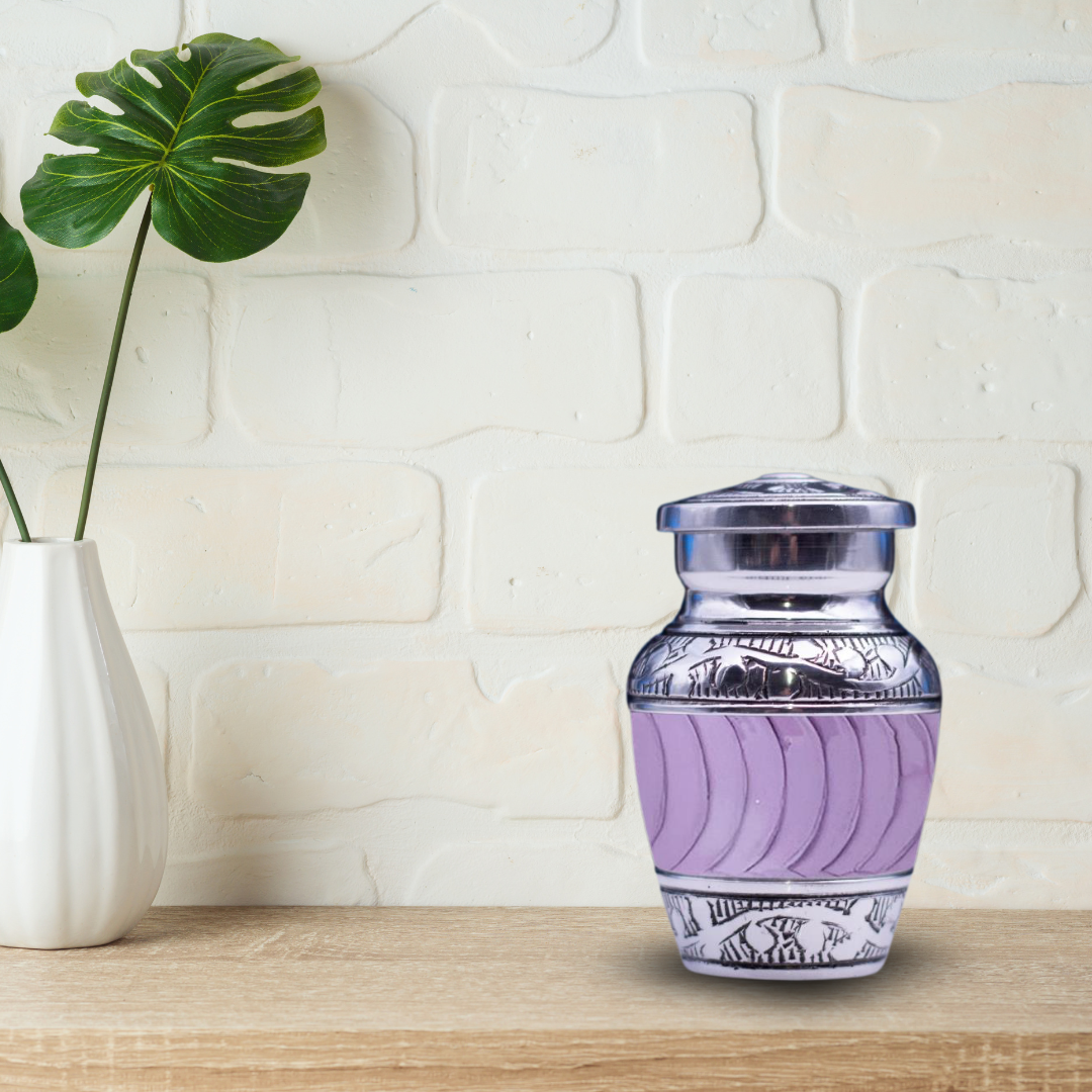 A keepsake urn is a small urn that holds only a portion of a loved one’s ashes. Families use them to share ashes among relatives, keep a personal memento, or honor someone in multiple places. They’re usually palm-sized (3 cubic inches) and come in many designs to reflect personal meaning.