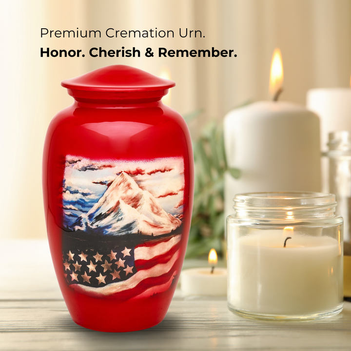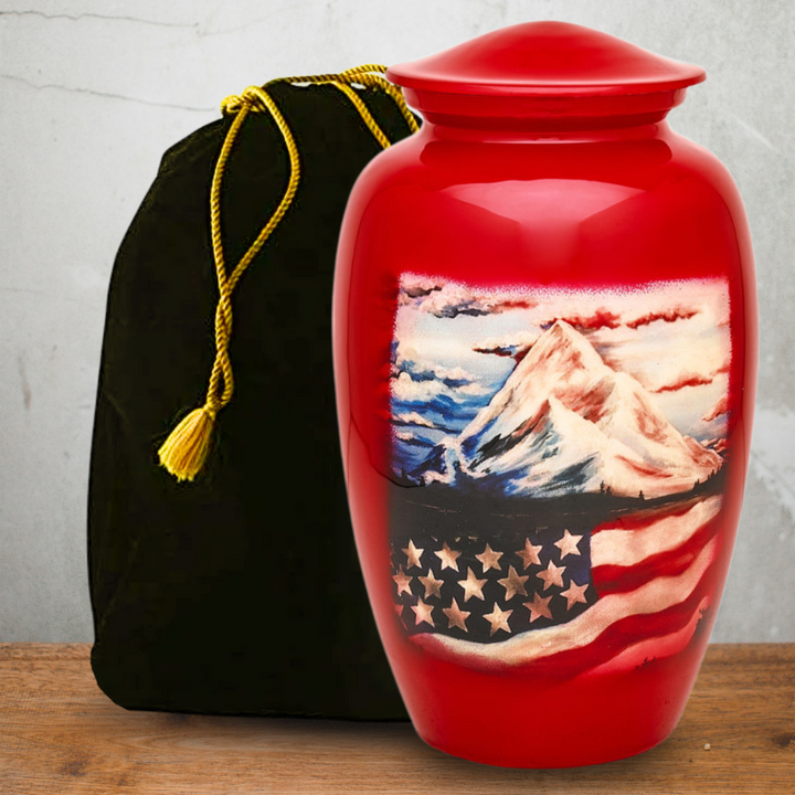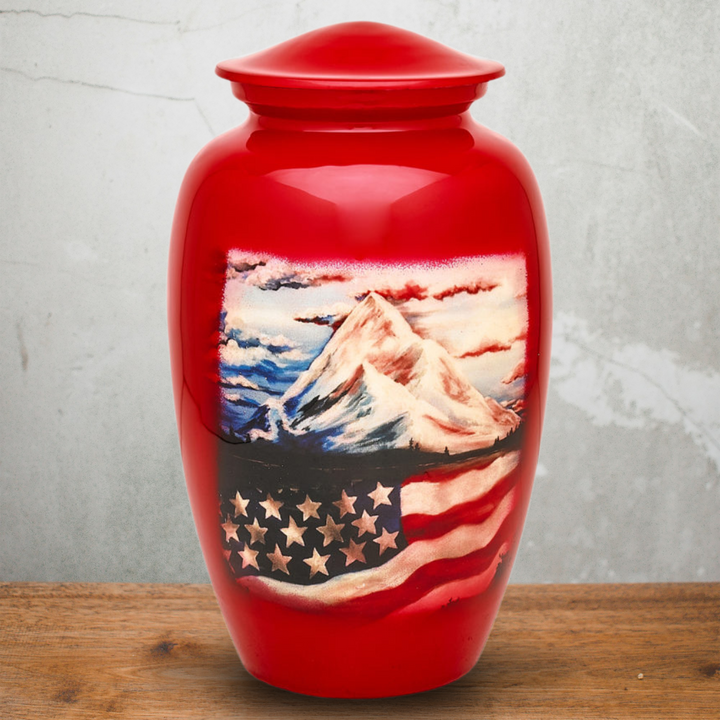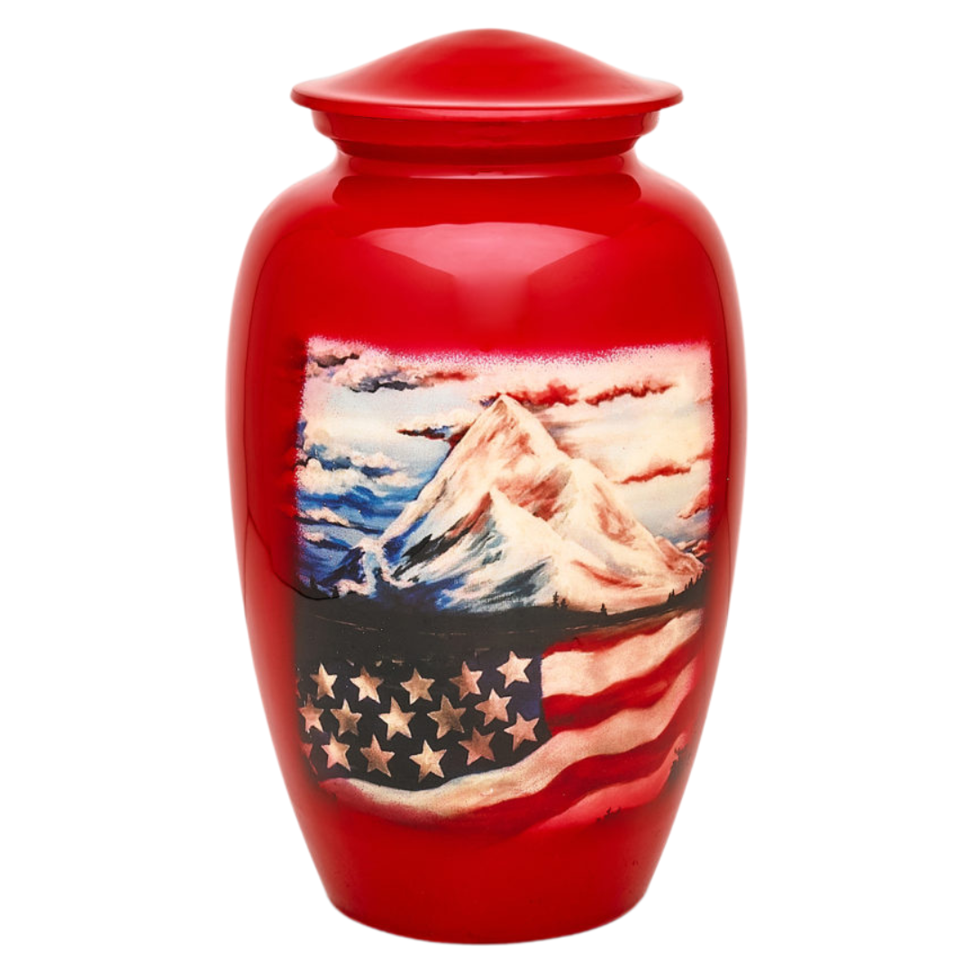 Red Patriotic Peak Adult Urn features an exclusive design by a US based artist