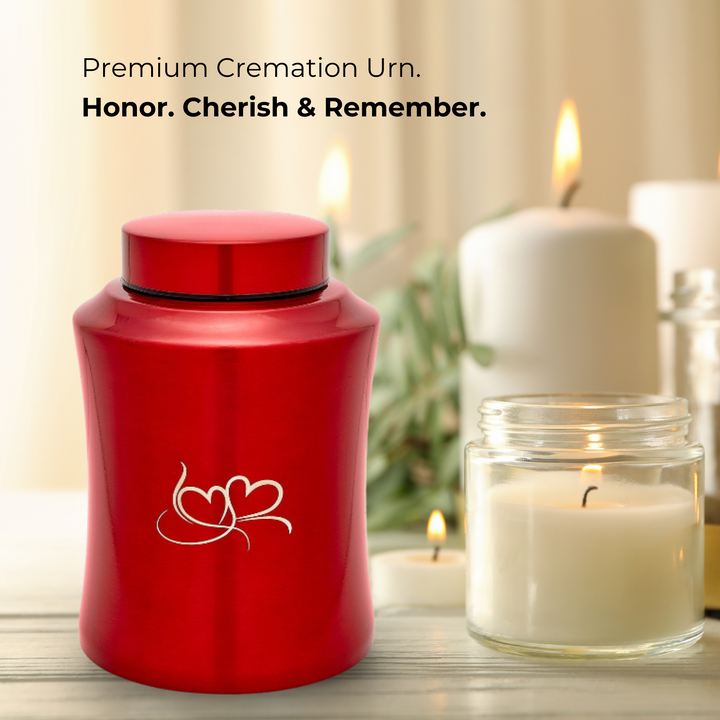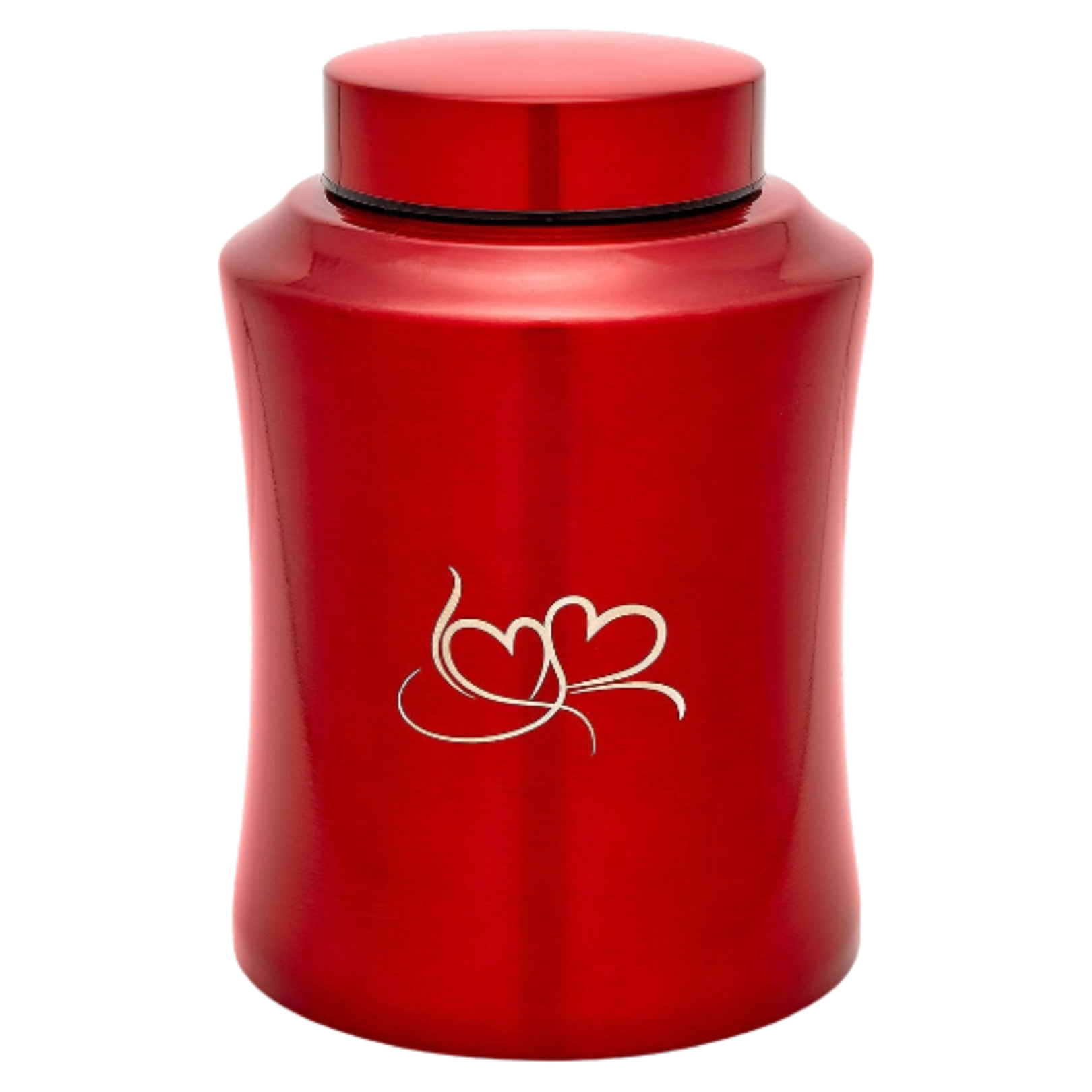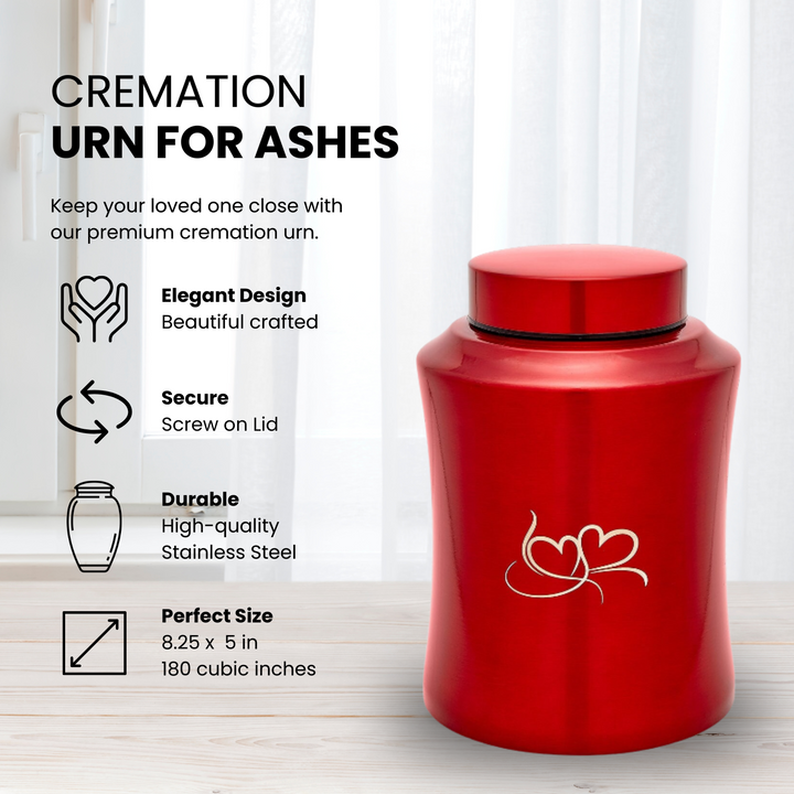Stainless Steel Two Hearst Adult Urn features a red colored stainless steel urn with two linked hearts