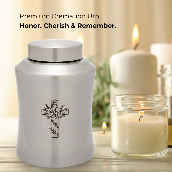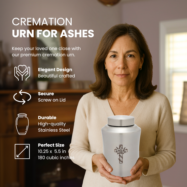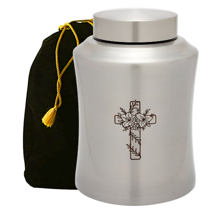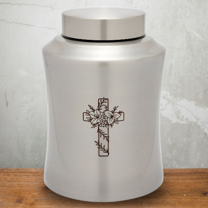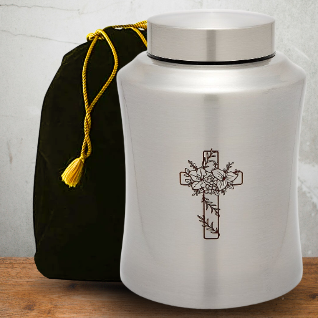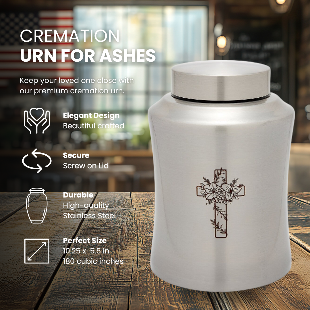 Stainless Steel w/Cross Adult Urn features a stainless steel colored stainless steel urn with a cross covered by flowers engraved on it