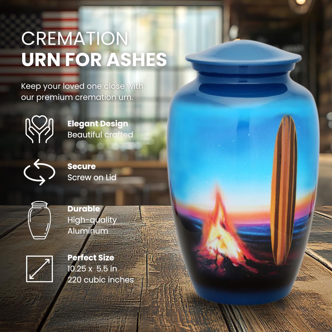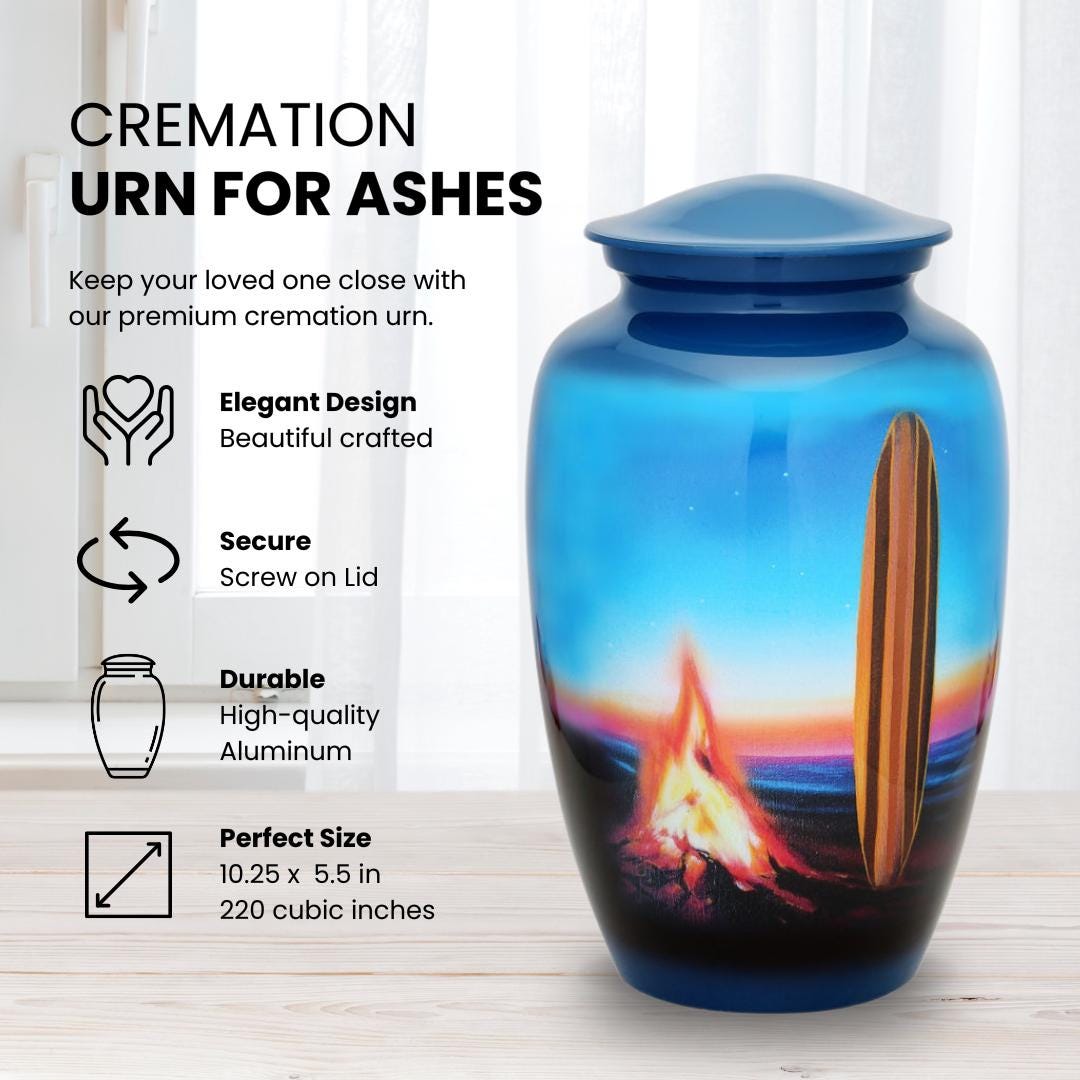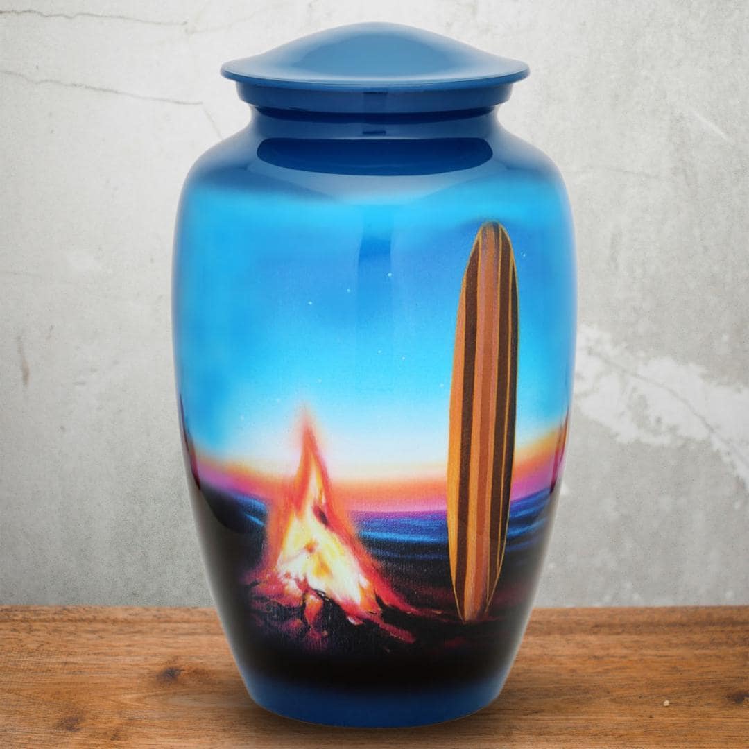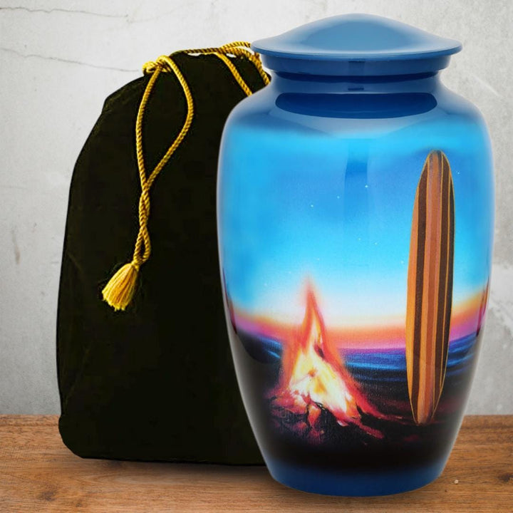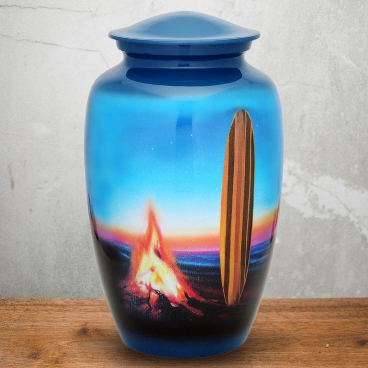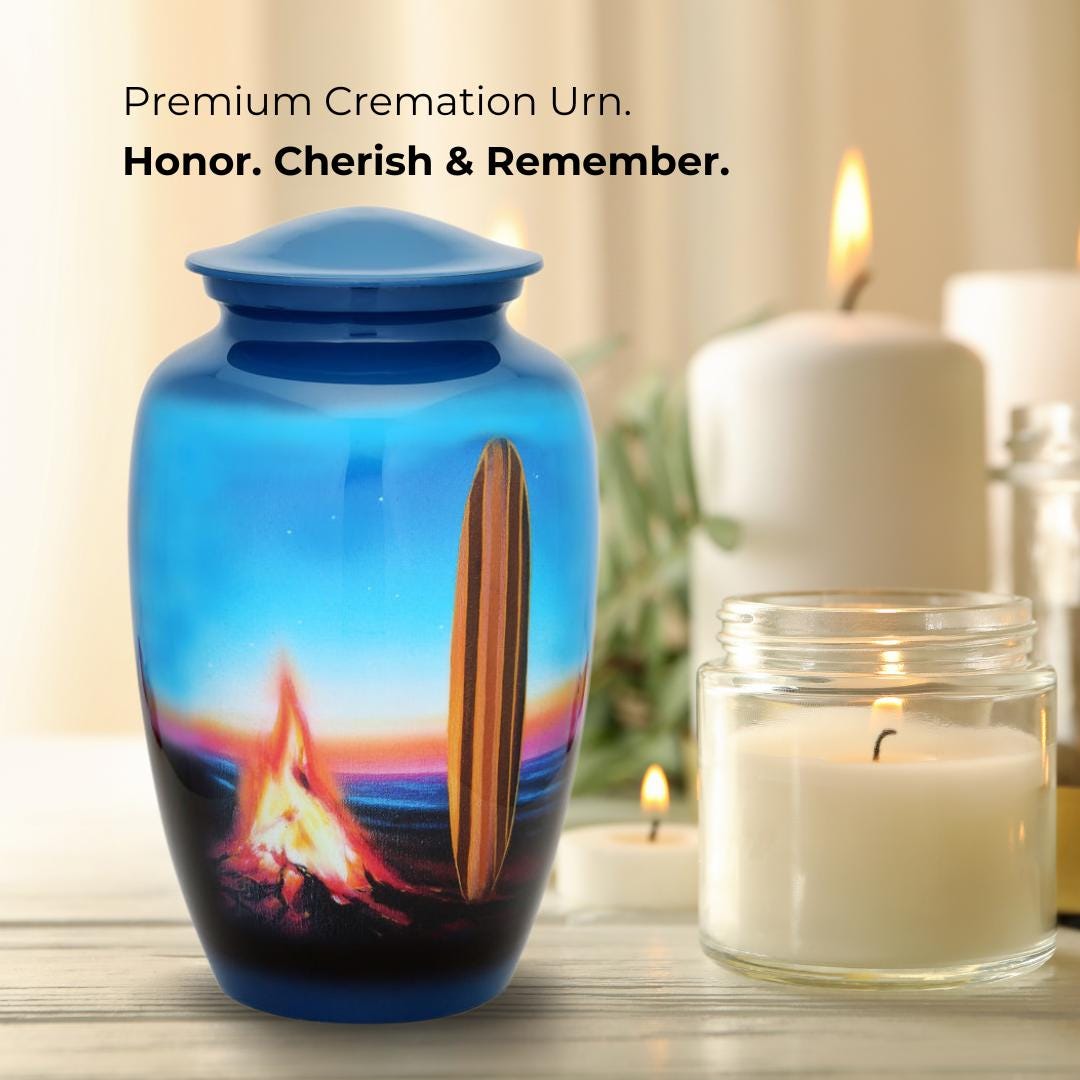 Surfers Respite Adult Urn depicts a scene as imagined and created, exclusively by a prominent America artist. A surfboard is seen planted in the beach next to a roaring bonfire.