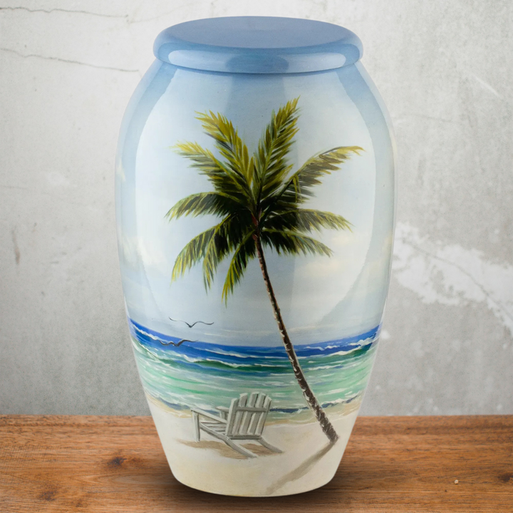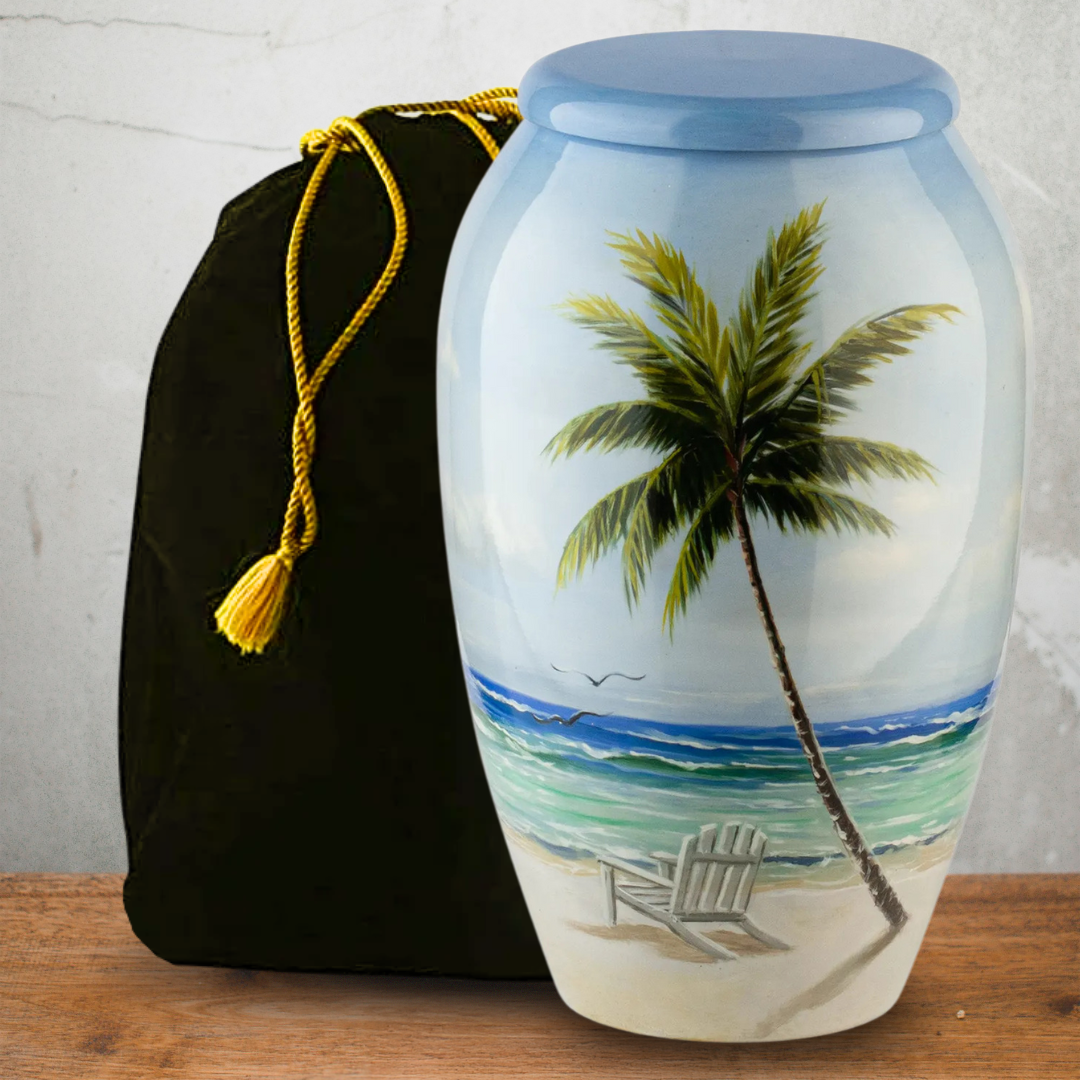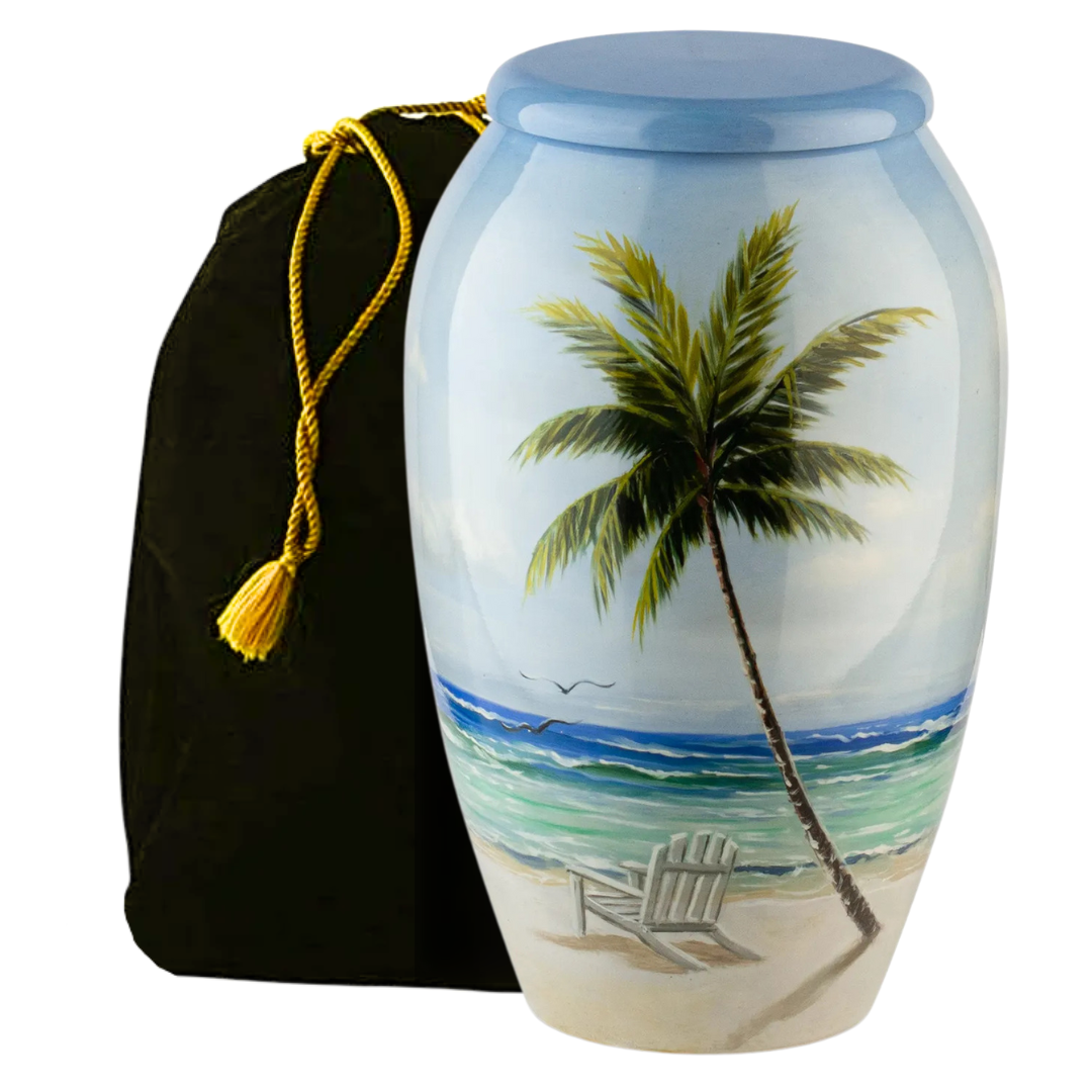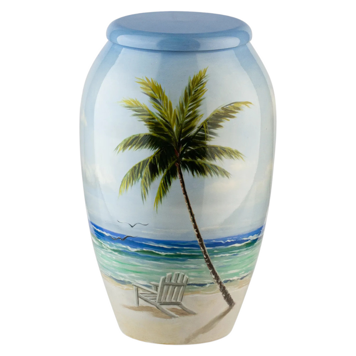 Under The Palm Adult Urn is a hand painted urn depicting a tropical oasis with a swaying palm tree and rushing waves