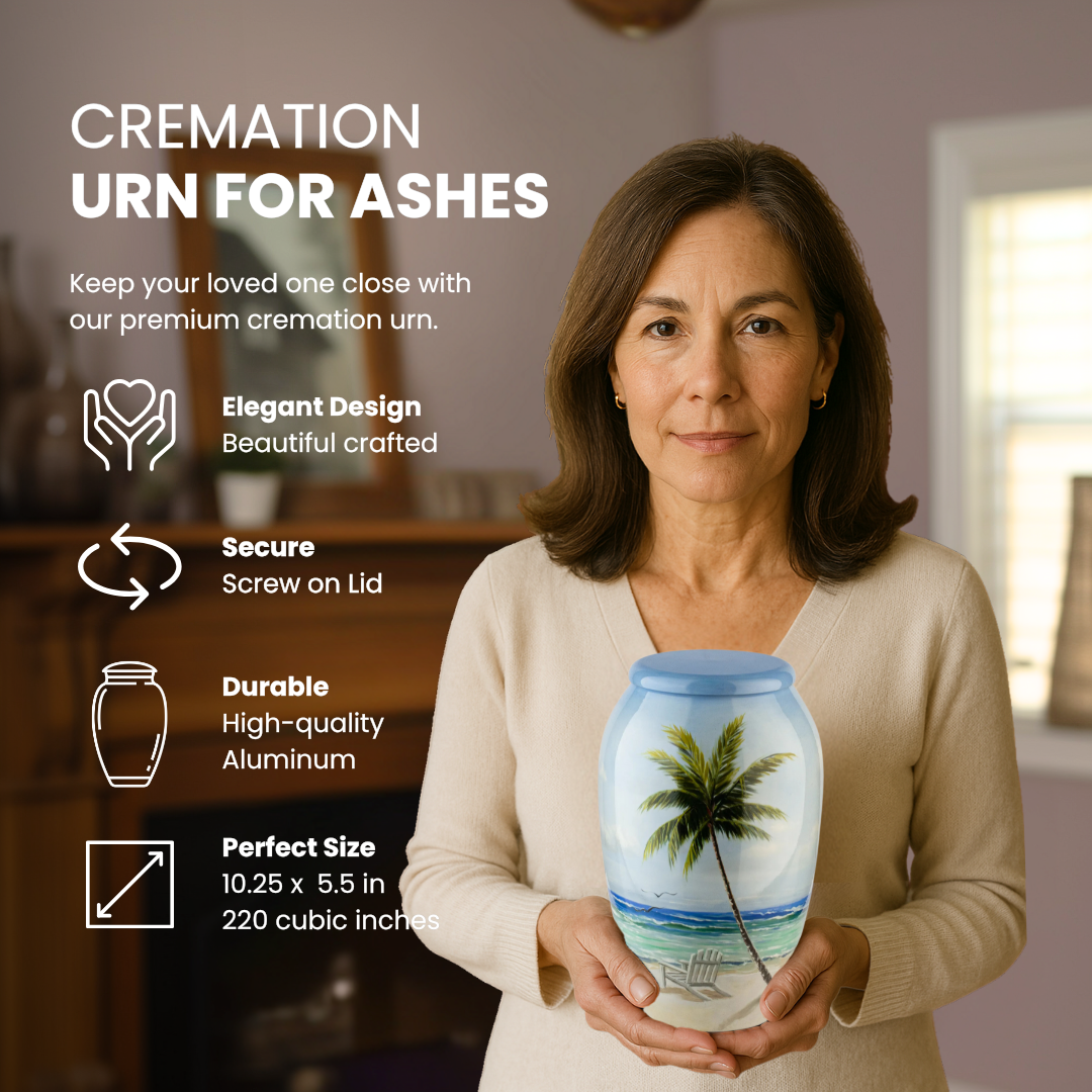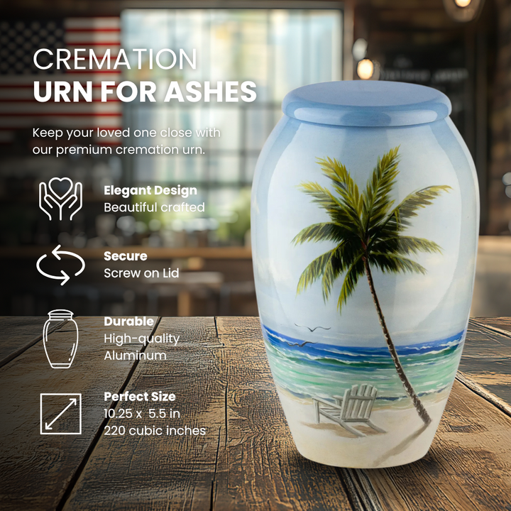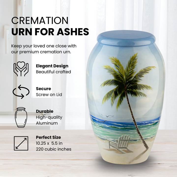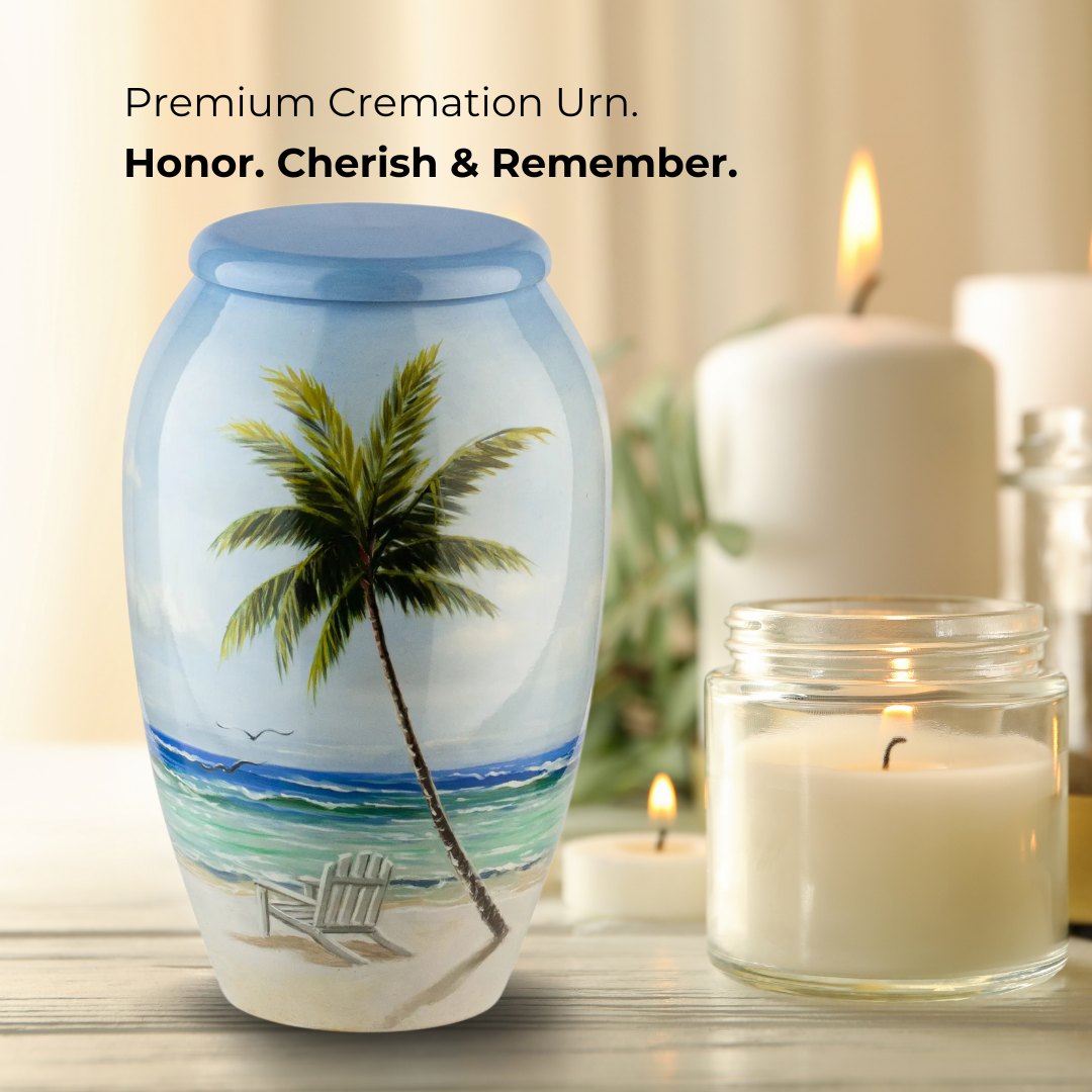 Under The Palm Adult Urn is a hand painted urn depicting a tropical oasis with a swaying palm tree and rushing waves